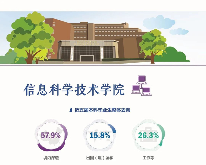 2016-2020届信息科学技术学院毕业生中,15.8%选择出国(境)留学,57.9%在境内深造,26.3%选择工作等。