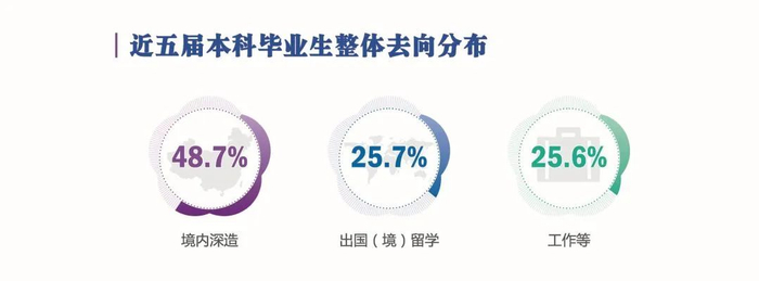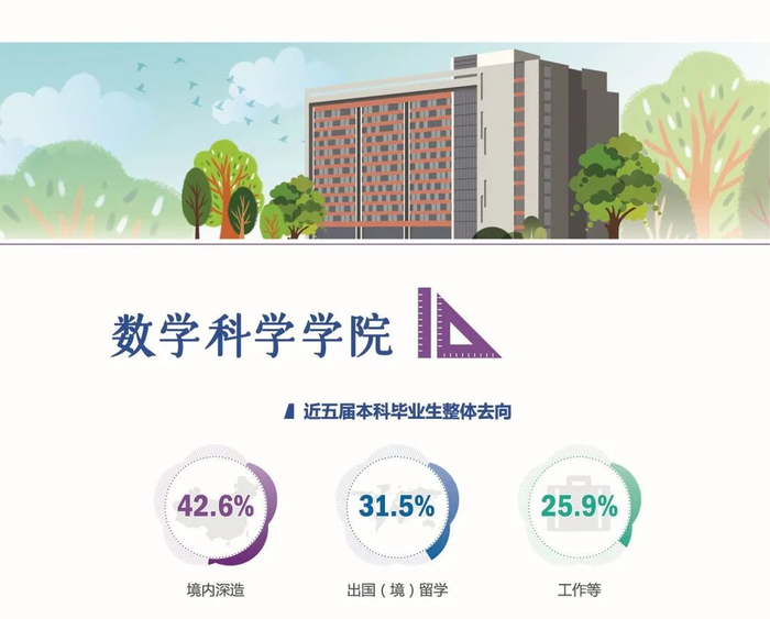 2016-2020届数学科学学院毕业生中,31.5%选择出国(境)留学,42.6%在境内深造,25.9%选择工作等。