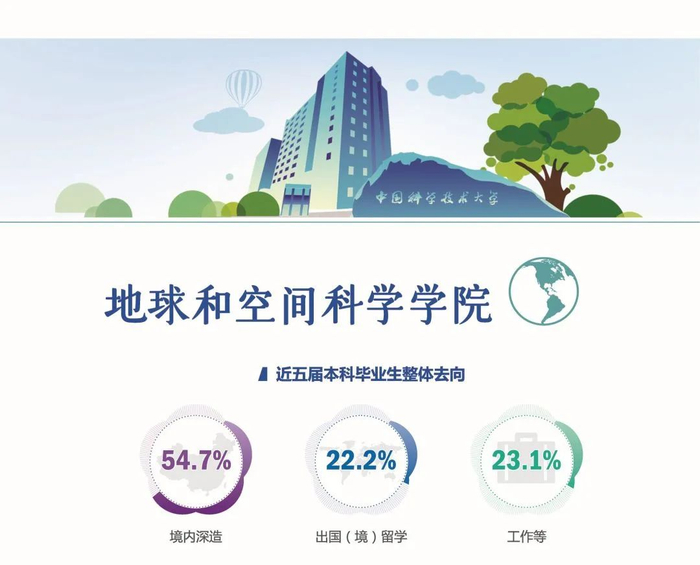 2016-2020届地球和空间科学学院毕业生中,22.2%选择出国(境)留学,54.7%在境内深造,23.1%选择工作等。