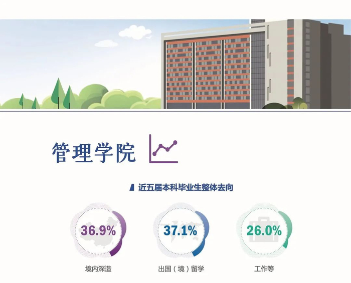2016-2020届管理学院毕业生中,37.1%选择出国(境)留学,36.9%在境内深造,26.0%选择工作等。