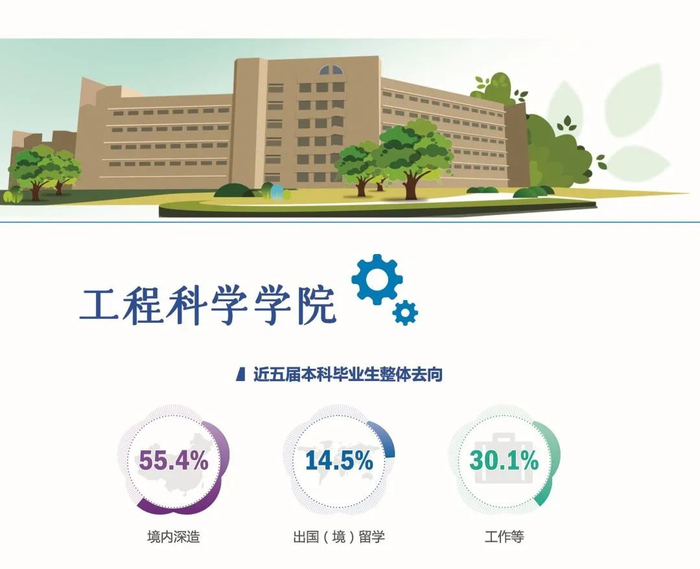 2016-2020届工程科学学院毕业生中,14.5%选择出国(境)留学,55.4%在境内深造,30.1%选择工作等。