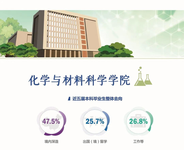 2016-2020届化学与材料科学学院毕业生中,25.7%选择出国(境)留学,47.5%在境内深造,26.8%选择工作等。