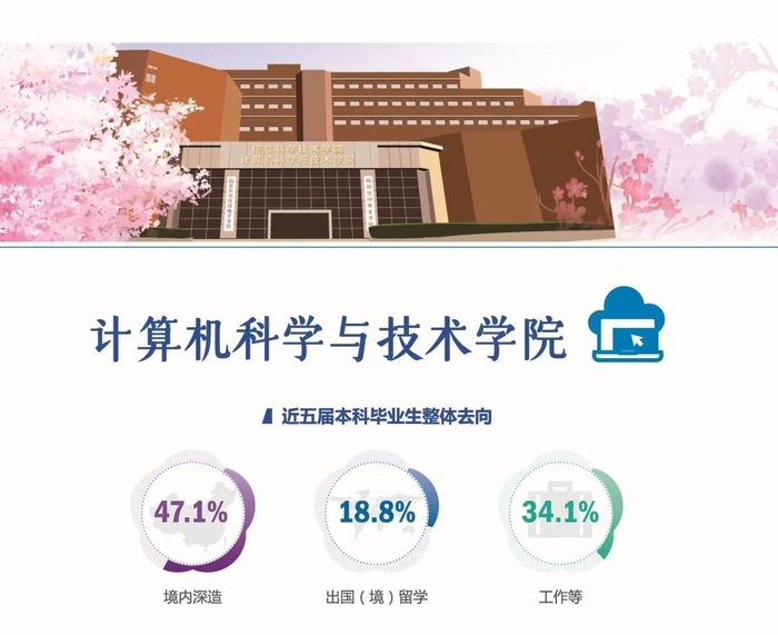 2016-2020届计算机科学与技术学院毕业生中,18.8%选择出国(境)留学,47.1%在境内深造,34.1%选择工作等。