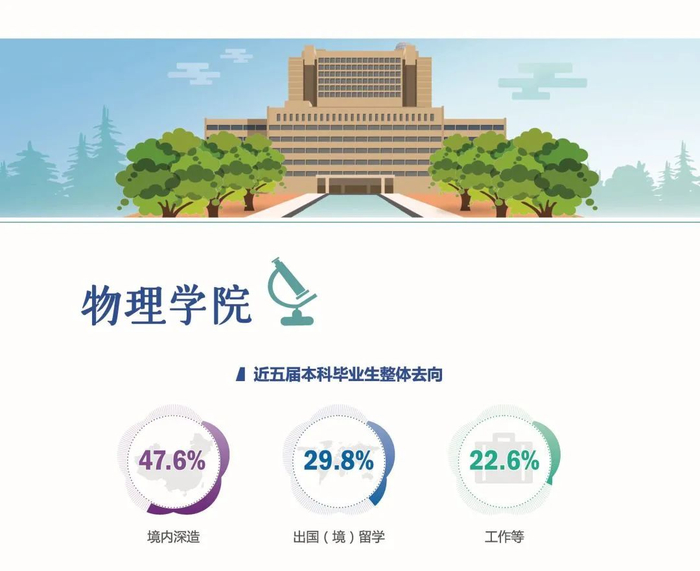 2016-2020届物理学院毕业生中,29.8%选择出国(境)留学,47.6%在境内深造,22.6%选择工作等。
