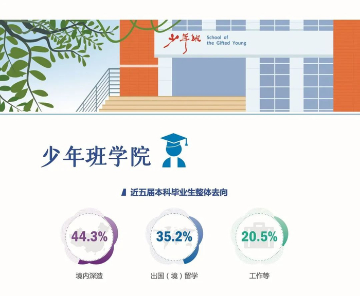 2016-2020届少年班学院毕业生中,35.2%选择出国(境)留学,44.3%在境内深造,20.5%选择工作等。