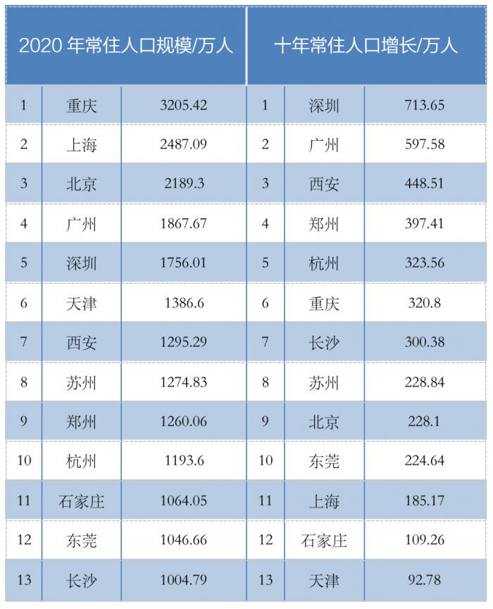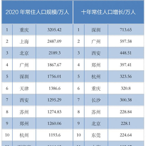 同时对比2010年,西安、郑州、长沙、重庆等中西部城市的人口表现突出,都实现了300万以上人口增长,也一定程度上体现出过去十年中西部省会城市崛起、人口回流的趋势。
