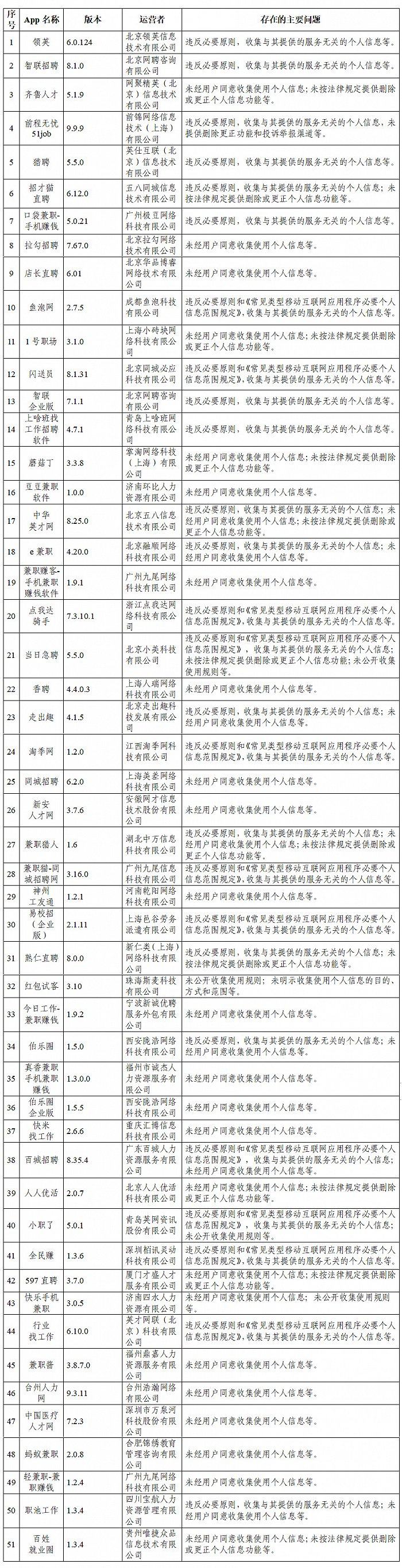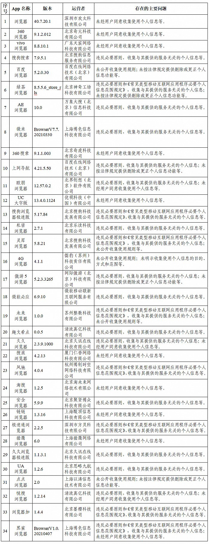 近期,针对人民群众反映强烈的App非法获取、超范围收集、过度索权等侵害个人信息的现象,国家互联网信息办公室依据《中华人民共和国网络安全法》《App违法违规收集使用个人信息行为认定方法》《常见类型移动互联网应用程序必要个人信息范围规定》等法律和有关规定,组织对短视频、浏览器、求职招聘等常见类型公众大量使用的部分App的个人信息收集使用情况进行了检测。现将有关情况通报如下: