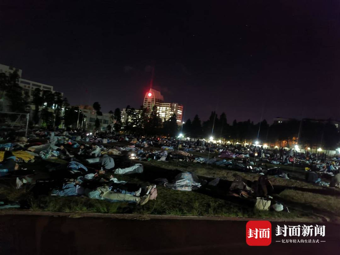 原标题:余震不断师生市民操场打地铺 “天冷风大睡不着,刷着手机等待好消息”