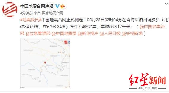 中国地震台网正式测定:5月22日02时04分在青海果洛州玛多县(北纬34.59度,东经98.34度)发生7.4级地震,震源深度17千米。