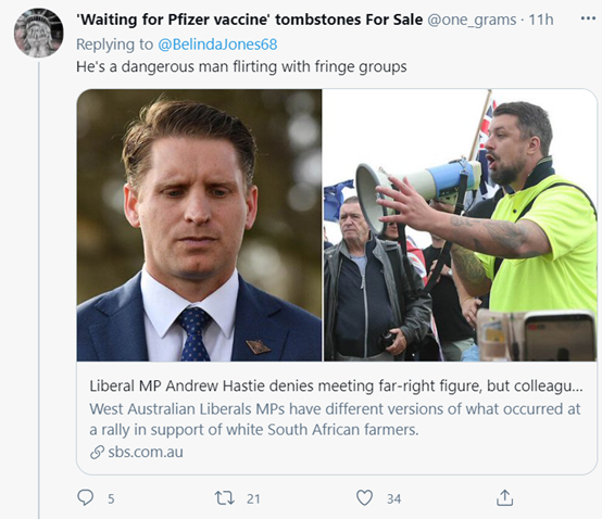 另外,有澳大利亚网民还曝出,这个海斯蒂曾与澳大利亚的极右翼组织的人物有染,与后者一起参加过2019年的一场支持南非白人农民的活动。而且很奇怪的是,尽管当时大量证据都显示海斯蒂和这个极右翼分子有过交谈,但他却坚持否认此事。