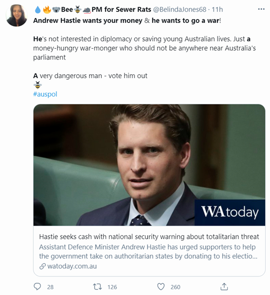 “安德鲁·海斯蒂想要你的钱,然后去发动战争!他根本不在乎外交,或是挽救年轻的澳大利亚人的生命。他只是一个渴求金钱的战争贩子,这种人根本就不该进入澳大利亚的议会”,一位获得了不少点赞澳大利亚网民这样写道。