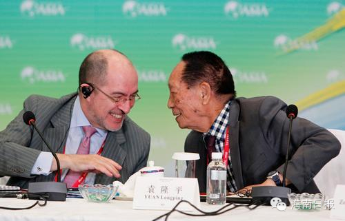 2013年4月8日, 在博鳌亚洲论坛2013年年会举行分论坛“粮食安全 — 亚洲携手 共同面对”上,中国工程院院士、杂交水稻之父袁隆平(右)和世界贸易组织副总干事Alejandro Jara在会上交流观点。海南日报记者 宋国强 摄