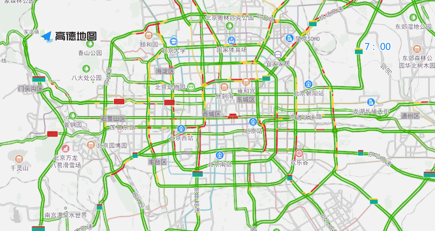 早高峰期间,广渠门、中关村、牛街等中小学较为集中的地区交通压力较大,周边环路、桥区节点等容易出现车流集中的情况,最高峰出现在7:00—7:30。建议尽量避开上述区域,以及一零一中学、北京四中等周边道路行驶缓慢的学校。