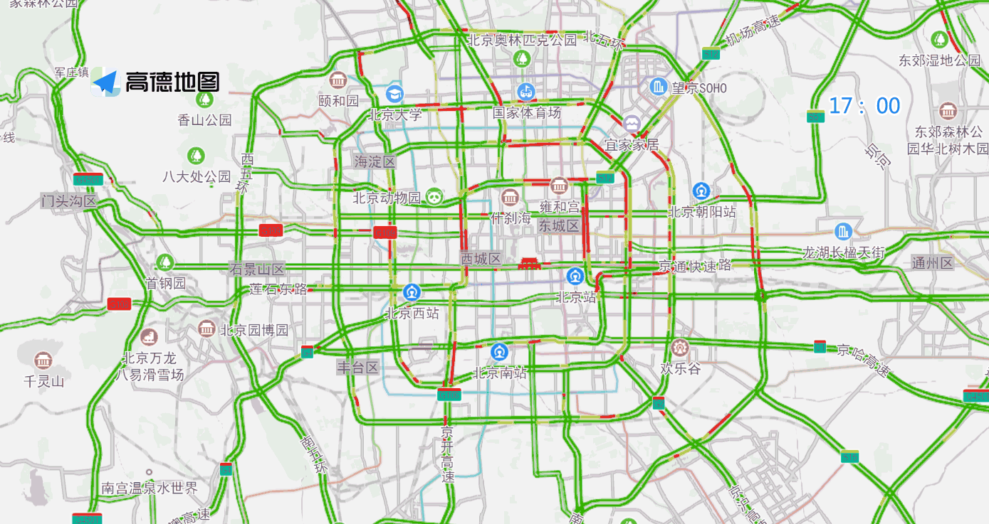 晚高峰期间,东、西、北二、三、四环,东、西五环,丰体南路、建外大街、通惠河北路、莲石东路等城区道路出京方向通行压力较大,京藏高速、京承高速、京通快速、京港澳高速、机场高速等将出现出京的潮汐车流,17:30—19:30,路面通行压力都比较大。