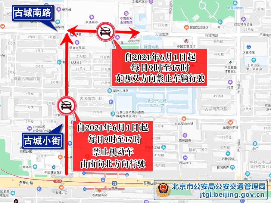 为保证石景山区古城地区部分道路的交通安全与畅通,根据道路交通安全法律法规有关规定,决定自2021年6月1日起,古城南路(古城小街至古城电影院段)每日9时至17时东西双方向禁止车辆行驶;古城小街由每日7时至19时禁止机动车由南向北方向行驶调整为每日9时至17时禁止机动车由南向北方向行驶。
