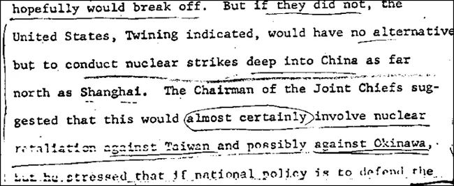 根据这份机密文件的内容,在1958年炮击金门开始两天后(8月25日),时任美国空军太平洋司令部指挥官劳伦斯•库特(Laurence Kuter)就向美国政府要求核武器授权。他认为,如果局势升级,在美军不首先使用核武器的情况下,美国空军以常规武器手段“协防台湾离岛”的计划缺乏胜算。