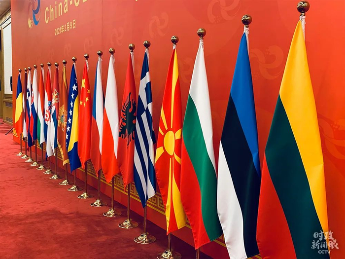 2021年2月9日,中国-中东欧国家领导人峰会现场摆放18面与会国国旗(总台央视记者范一鸣拍摄)