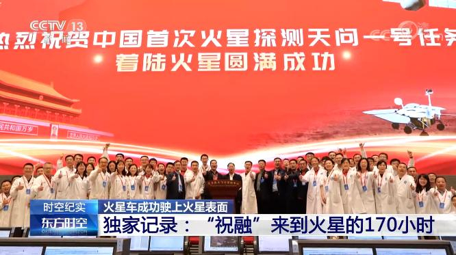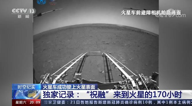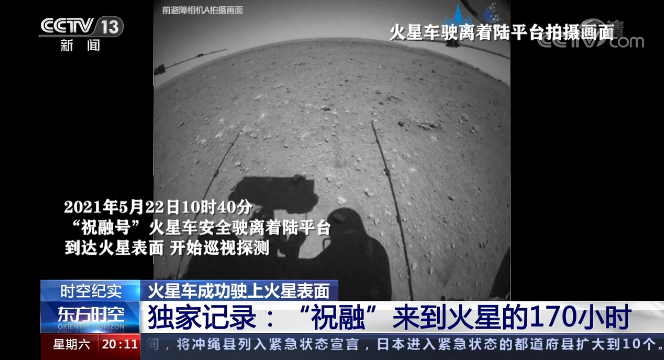 记者:我们听到现场响起了热烈的掌声,从屏幕上显示的这个后避障相机拍摄的影像可以清楚地看到,祝融号火星车已经成功驶离了着陆平台,踏上了红色的星球——火星。