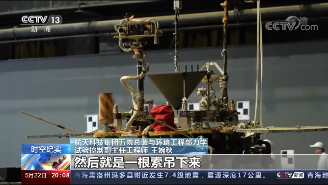 航天科技集团五院总装与环境工程部力学试验控制副主任工程师 王婉秋:这个就是我们的低重力环境模拟,它是一个很关键的实验设备,虽然你看起来它很简单,感觉像是一个吊车,然后就是一根锁吊下来,但实际上它承担了一个非常重要的任务,并且它的技术非常复杂。就是因为在火星上它的重力是地球的3/8,所以在地面上做实验的时候,我们一定要去补偿它部分的重力。