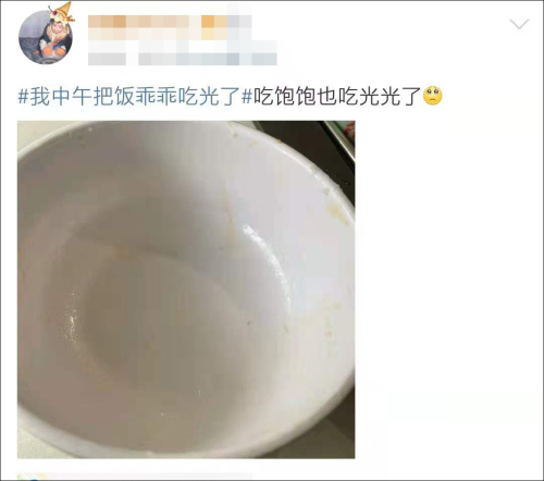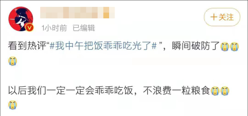 “我中午把饭乖乖吃光了。”这条被顶到微博热搜的热评,让万千网友“破防”。