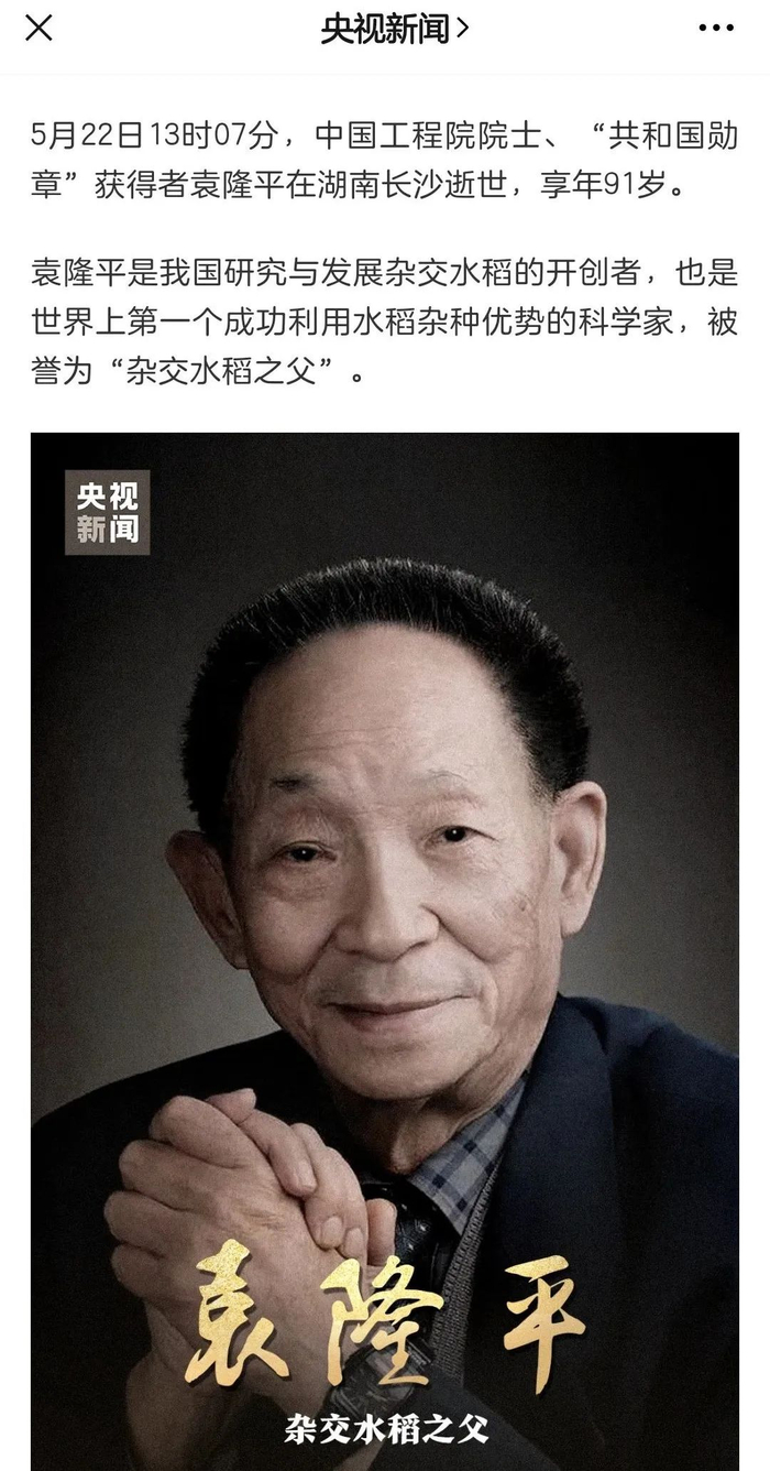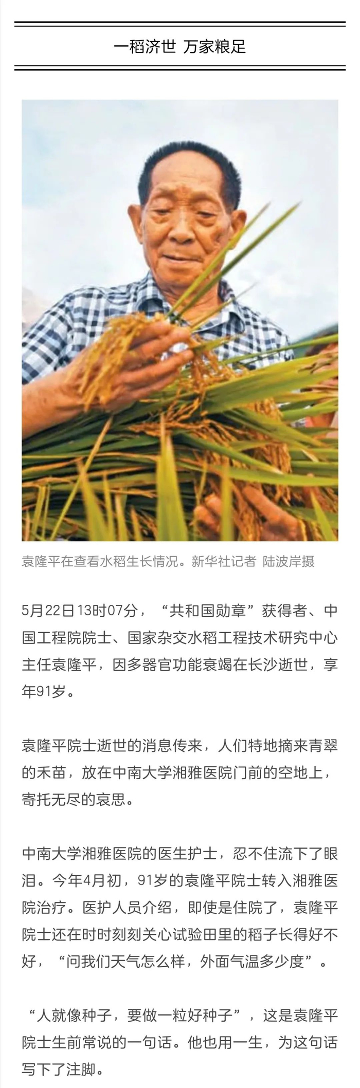 2021年5月22日13时07分,“共和国勋章”获得者、中国工程院院士袁隆平逝世,享年91岁。2021年5月23日,《人民日报》刊文追记“杂交水稻之父”袁隆平。2021年5月24日(星期一)上午10:00,在长沙市明阳山殡仪馆铭德厅举行袁隆平同志遗体送别仪式。此刻,让我们缅怀袁老,重温他于2019年10月23日发表在《人民日报》上的文章《我的两个梦》(节选)。