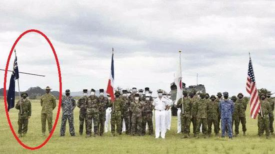 美日法澳四国军演陆上部分,澳大利亚派出两名士兵和一面国旗参与