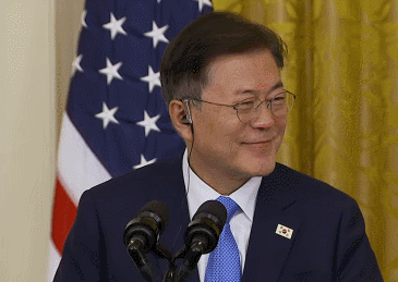 这是在美国访问的韩国总统文在寅,在当地时间521日下午于白宫举行的美韩联合记者会上的表现。其一本正经、一脸严肃地听着记者提问,然后慢慢露出笑容,不时偷瞄一眼身边的美国总统拜登。听完拜登蹦出来一句“祝你好运”后,不知如何是好的文在寅尬笑数秒。