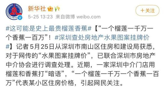 据新华社报道,记者5月25日从深圳市南山区住房和建设局获悉,对于网传的“水果图案挂牌价”,已联合深圳市房地产中介协会进行调查处理。