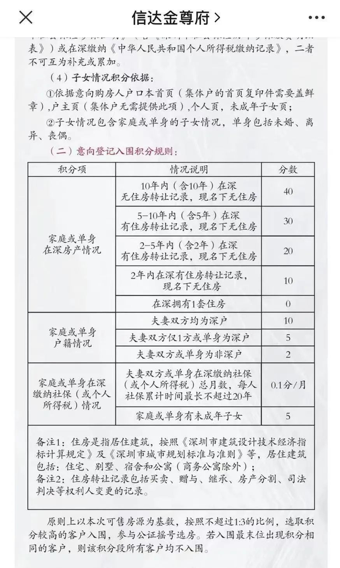 除了定期发布二手房成交参考价之外,深圳新房市场的打新规则也在不断调整当中,最近公布的保利勤诚达誉都销售方案和信达金尊府的销售方案显示,关于买房积分的规则又有了新变化,积分新规则再细化了过去10年内有房产转让记录的积分,同时对社保时长进行了上限的限制。其中,积分新增5-10年内(包含5年)在深有住房转让记录现名下无房,积30分;社保方面,夫妻积分每人封顶最高社保20年(以前不限);另外,子女积分从2分上升为5分。