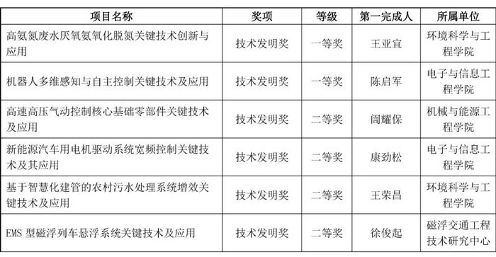 获技术发明奖一等奖2项,分别是环境科学与工程学院王亚宜教授主持完成的《高氨氮废水厌氧氨氧化脱氮关键技术创新与应用》和电子与信息工程学院陈启军教授主持完成的《机器人多维感知与自主控制关键技术及应用》。