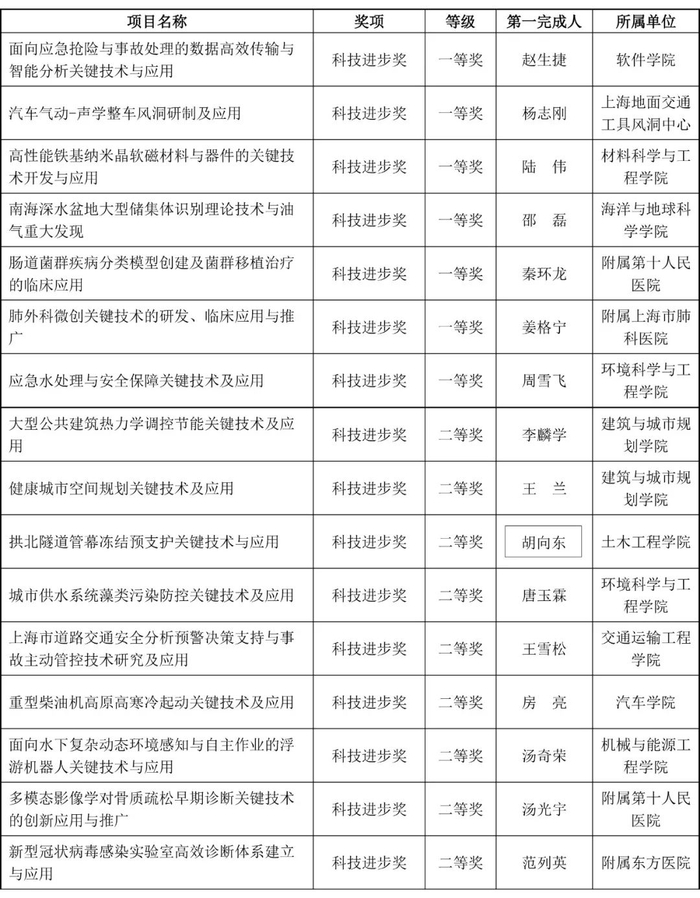 获科技进步奖一等奖7项,分别是附属第十人民医院秦环龙教授主持完成的《肠道菌群疾病分类模型创建及菌群移植治疗的临床应用》、附属上海市肺科医院姜格宁教授主持完成的《肺外科微创关键技术的研发、临床应用与推广》、材料科学与工程学院陆伟教授主持完成的《高性能铁基纳米晶软磁材料与器件的关键技术开发与应用》、软件学院赵生捷教授主持完成的《面向应急抢险与事故处理的数据高效传输与智能分析关键技术与应用》、海洋与地球科学学院邵磊教授主持完成的《南海深水盆地大型储集体识别理论技术与油气重大发现》、上海地面交通工具风洞中心杨志刚教授主持完成的《汽车气动-声学整车风洞研制及应用》、环境科学与工程学院周雪飞教授主持完成的《应急水处理与安全保障关键技术及应用》。
