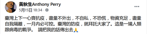 5月15日台湾本土确诊病例暴增,黄秋生当时还发了贴文呼吁台湾人民齐心抗疫,称做到“不外出、不自私、不恐慌、物资充足、尽量自我隔离”,台湾一个月就能把疫情控制住。