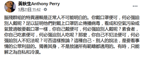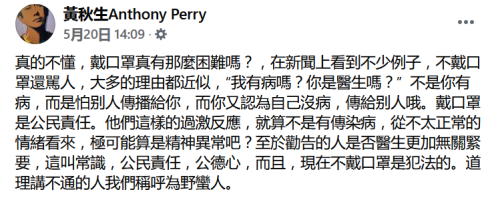 停工后的黄秋生宛如“防疫标兵”,常在脸书上大骂不戴口罩的台湾民众是“野蛮人”“脑残”。