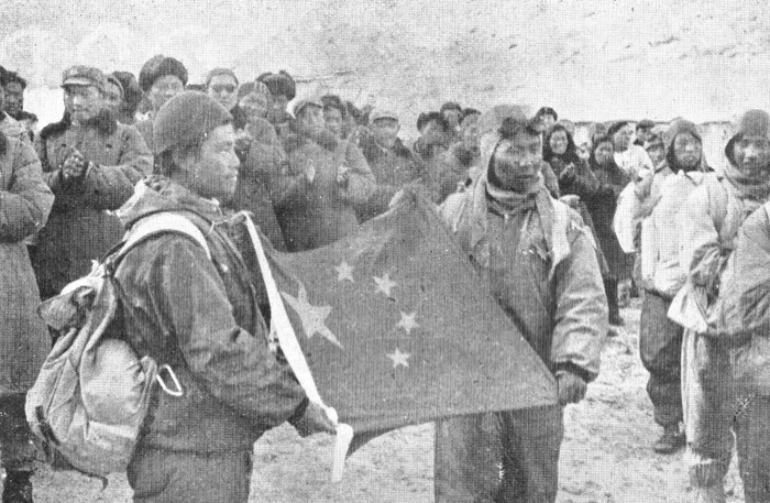 手捧毛主席塑像,展开五星红旗登山运动员向祖国宣誓