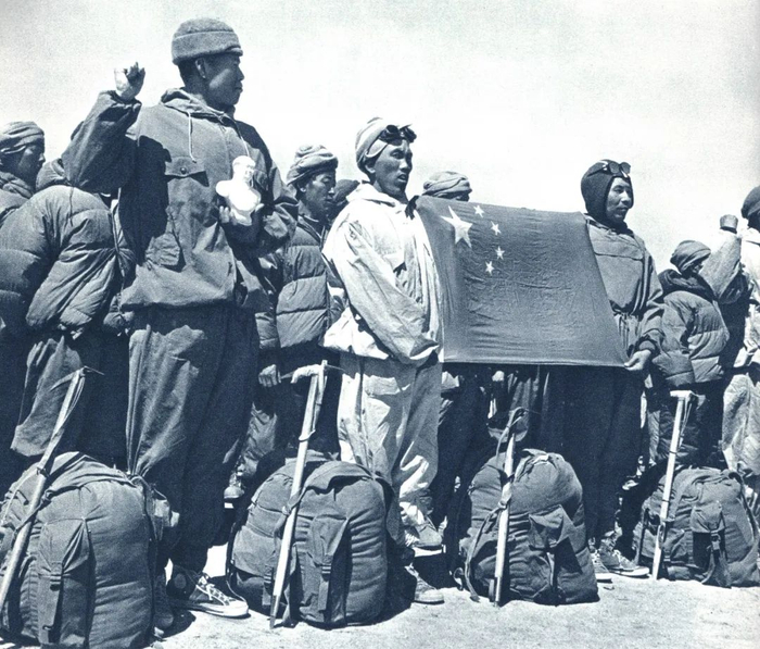 克服一切困难,一定要把祖国的五星红旗插上珠穆朗玛峰。执旗手右为王富洲