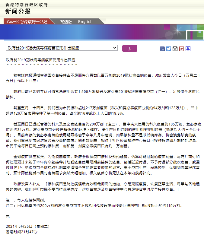 香港特区政府网5月25日发布新闻公告称,就有媒体报道指香港因疫苗接种率不足而将弃置数以百万剂的新冠疫苗,政府发言人作以下回应: