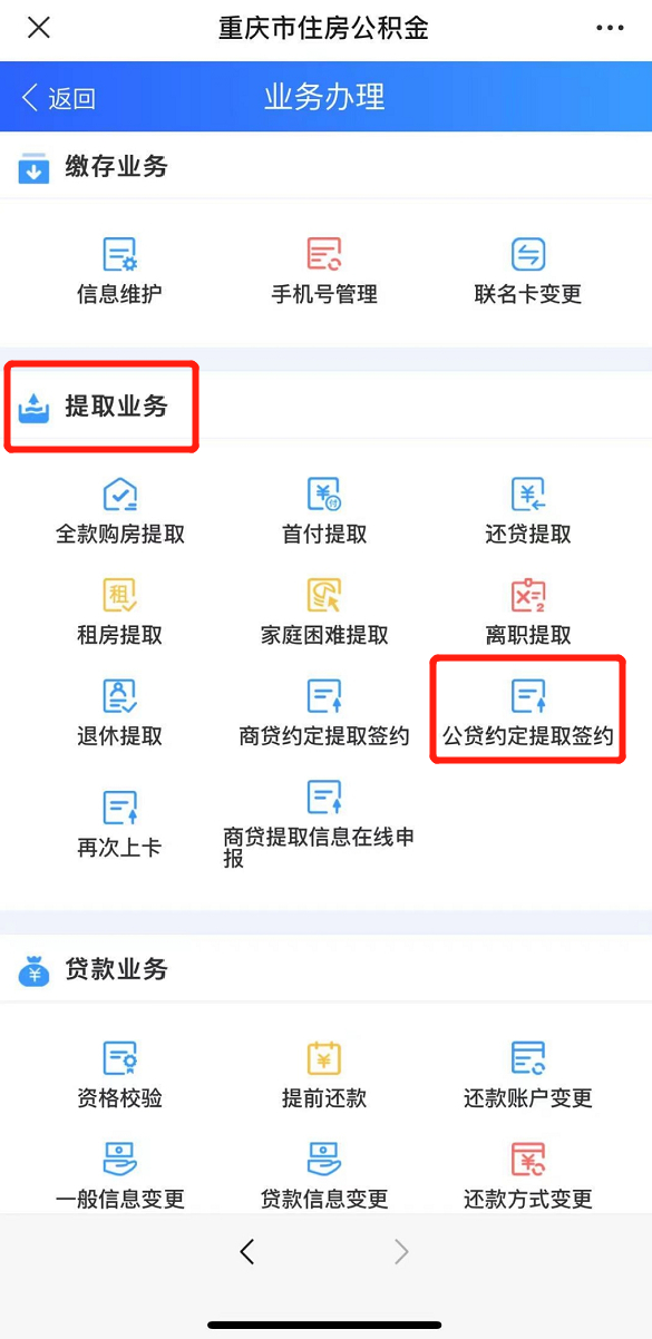 职工须先行与市住房公积金中心办理签约手续,已开通在线提取的已婚职工,可通过重庆市住房公积金微信公众号、个人网厅等线上渠道,自助办理住房公积金贷款冲还贷、住房公积金组合贷款和贴息贷款约定提取签约,职工无须提供任何材料;单身职工可通过临柜方式办理签约手续。