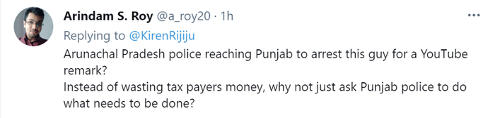 “‘阿鲁纳恰尔邦’警方跑到旁遮普,为了一句YouTube上的言论逮捕这个家伙?与其浪费纳税人的钱,为什么不直接让旁遮普警方去做需要做的事呢?”