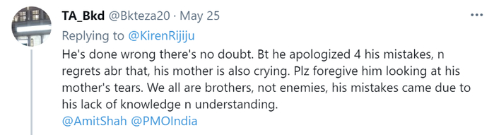 “毫无疑问他做了错事。但是他为错误道歉了,他妈妈也哭了。请原谅他吧,看看他母亲的眼泪。我们是兄弟,不是敌人。他的错误是由于他缺乏知识和理解。”