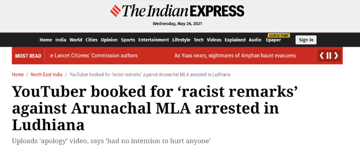 报道称, “阿鲁纳恰尔邦”的一些人投诉这段视频,被批评的国会议员埃林在接受《印度快报》时称,帕拉斯的评论相当于“种族歧视”。