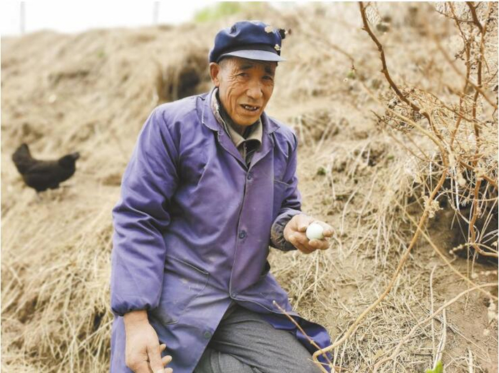 69岁的脱贫户蔡维成身着蓝色工作服从一旁的“宿舍”走出,娴熟地走进鸡舍称出饲料,分别添入3栋鸡舍外的食槽内。随后,他健步走向山坡,将手伸向山间被青草覆盖的一个个“小山洞”。他说:“鸡会在这里面下蛋,而我每天最主要的工作除了给它们喂食,就是在这上百个‘小山洞’里寻找鸡蛋。每天可找到150个到200个不等。”
