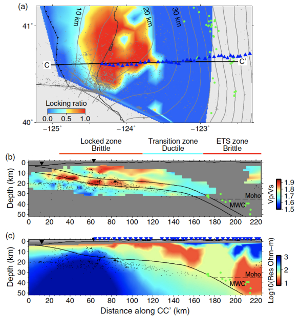 Cascadia俯冲带南段板块界面的震间耦合模型(a)以及沿着CC’剖面的地震波速比模型(b)和前人的电阻率模型(c)。