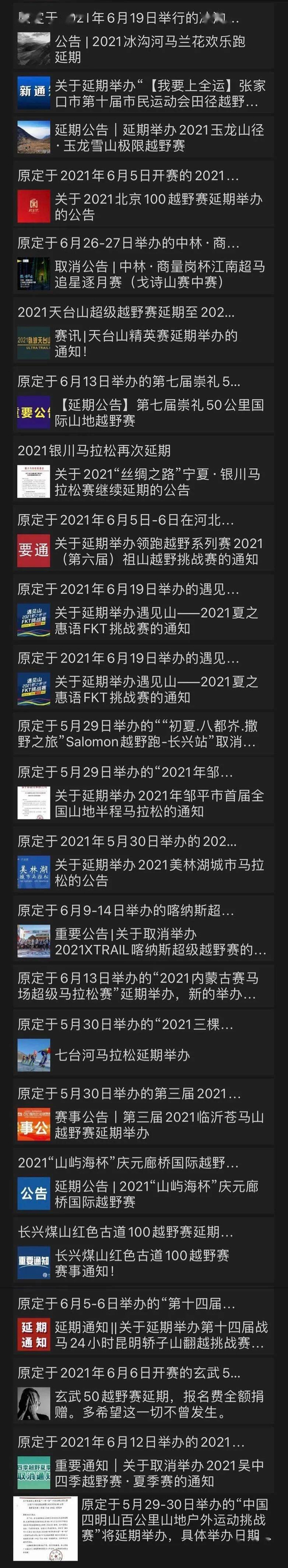 5月26日,许多跑友圈的话题是转发各类“比赛延期”的通知:2021“丝绸之路”宁夏-银川马拉松赛组委会发布公告称,受到疫情和天气等因素的影响,组委会决定启动大型赛事熔断机制,继续延期原定于5月30日举办的比赛。原定于6月13日举办的2021兰州马拉松也宣布延期。浙江省体育总会发布《紧急通知》,暂停中长跑和越野赛等全省相关赛事活动。截至目前,已经超40场比赛或延期或取消。
