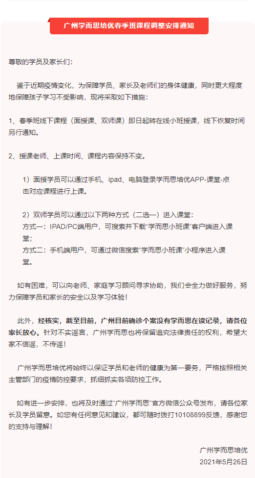 5月26日,广州市荔湾区新型冠状病毒肺炎疫情防控指挥部通报,广州新增2例确诊,1例无症状感染者,其中一确诊病例为五年级小学生,随后网传该小学生为学而思学员,周末曾在广州学而思某校区上培训班。“广州学而思”微信公众号5月26日发布春季班课程调整安排通知,此外辟谣称,经核实,截至目前,广州目前确诊个案没有学而思在读记录,请各位家长放心。