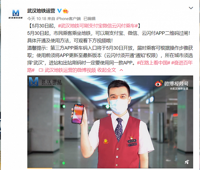 原标题:武汉地铁:5月30日起可刷支付宝、微信、云闪付乘车