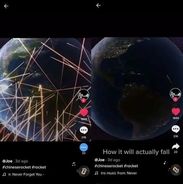 网友@Joe分享了了一段视频,前半段是“你以为中国火箭坠落的样子”,只见群星乱飞、毁天灭地;后半段是“它实际坠落的样子”,一颗,只是微微溅起一点小火星。