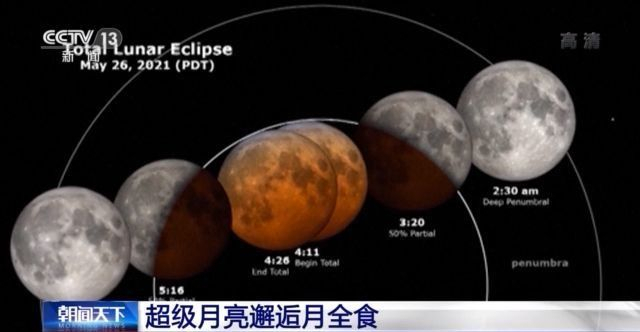 天文预报显示,这次月全食始于北京时间5月26日16时46分,此时月球开始稍微阴暗;17时45分,月面开始有缺;19时09分,月球完全进入地球本影;19时19分,月球的中心与地球本影的中心最近;19时28分,月球开始重现光芒;20时53分,月球走出地球本影;21时51分,月食现象结束。全部过程历时5小时零5分,其中本影食历时3小时零8分。