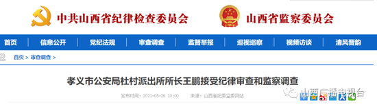孝义市公安局杜村派出所所长王鹏涉嫌严重违纪违法,目前正接受孝义市纪委监委纪律审查和监察调查。