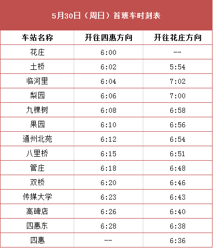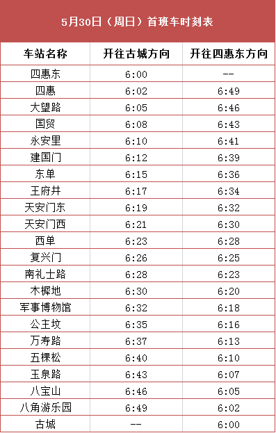 2、5月30日(本周日),1号线四惠东站、古城站,八通线花庄站首班车均调整至6:00,八通线四惠站首班车调整至6:36。