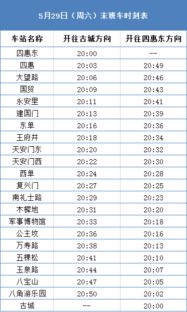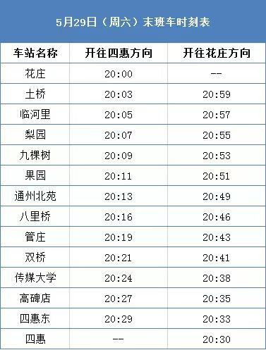 1、5月29日(本周六),1号线四惠东站、古城站,八通线花庄站末班车均调整至20:00,八通线四惠站末班车调整至20:30。